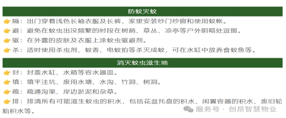 为此,创昂物业各项目积极响应,全面启动“预防登革热 健康共守护”行动,并为您献上预防登革热措施,共同筑起一道坚实的防蚊屏障。