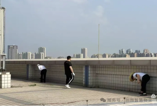 项目部马经理带领管理团队打响“我爱我校”高空“死角”攻坚战——清理综合楼11楼天台。物业管理团队全员上阵:拔草、搬运,分工协作不停歇。烈日当空,汗水浸透了工装,大家却笑着打趣鼓劲。当夕阳为洁净的天台镀上暖光,所有疲惫都化作了满满的成就感。