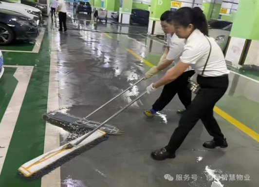 “我爱我校”行动延伸至负一楼停车场!主管们拿起高压水枪、拖把,对地面污渍、墙角积尘彻底清扫。水流冲刷过的地面泛起光泽,角落的灰垢被一一清除,整个停车场变得干净敞亮,为师生出行添一份清爽~