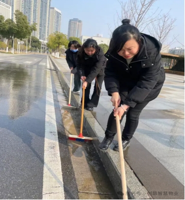 “路牙缝隙的泥沙也要冲干净!”项目部马经理带领大家,弯腰仔细冲洗着主干道的边角。各部门主管和领班分组协作,有的用刷子擦洗地砖污渍,有的清理排水沟落叶。经过2小时的奋战,校园路面重现本色,阳光下的水痕映照出物业人的专注。