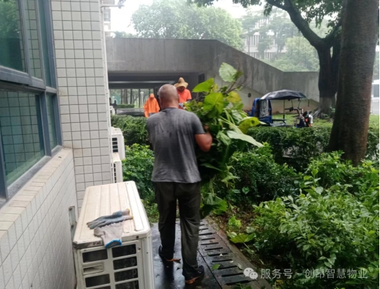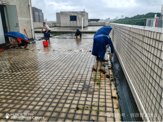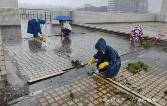 各部门联动对教学区、生活区各楼栋天面杂草、淤泥进行全面清理、管道疏通。
