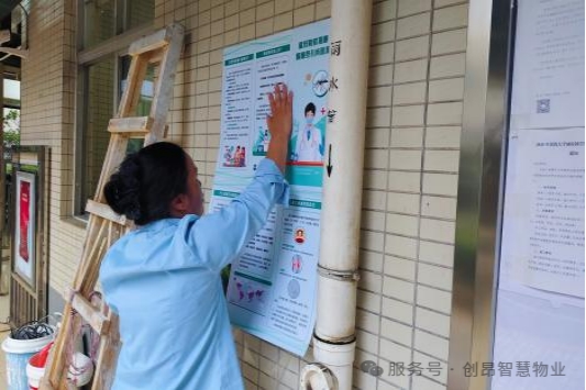 创昂团队安保部在校门口设立宣传点,向员工和师生发放"基孔肯雅热"预防手册。宣传牌醒目地摆放在出入口处,详细介绍了预防措施和注意事项。宿舍值班人员对学生宿舍各楼栋公告栏张贴基孔肯雅热宣传海报以及每天早晚在学生宿舍各楼栋楼梯口点灭蚊片,提醒大家注意防蚊灭蚊,保持环境卫生。这一举措有效提升了校园群体的疾病防范意识,为预防"两热"传播筑起了一道防护墙。